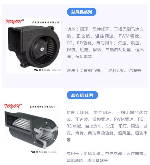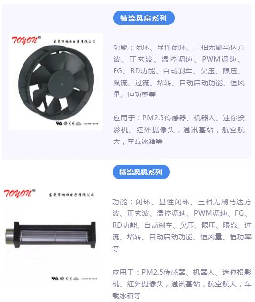 The company adheres to innovation and establishes the "X" and "TOYON" brands closely following the market. In 2002, it passed and fully introduced the ISO9001 international quality system certification. The cross-flow series, box series, blower series, bracket series, centrifugal series, motor series and other products produced by the company have successively passed UL, CE, SGS certification. It is widely used in computers, communication products, optoelectronic products, consumer electronics, automotive electronics, HVAC, construction, fresh air systems and other fields. On the basis of pursuing the highest cost performance, the company's products meet the market requirements in many ways, and meet the needs of customers in terms of temperature control, speed regulation, dustproof, moistureproof, waterproof and other special functional requirements.