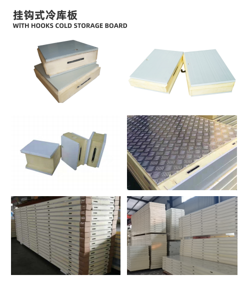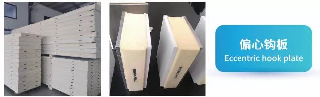 The structure of the eccentric hook plate is a polyurethane sandwich panel made with a traditional mold. The eccentric hook is embedded in the mold during production, and the eccentric hook is embedded around the core plate to facilitate splicing. It is generally suitable for small or medium-sized cold storage.