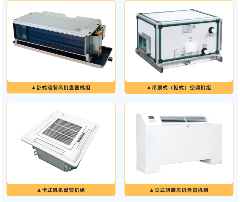 Horizontal concealed fan coil units, horizontal exposed fan coil units, vertical concealed fan coil units, vertical exposed fan coil units, ultra-thin fan coil units, cassette four-way fan coil units, wall-mounted fan coil units, high-airflow cabinet fan coil units, dry coils.