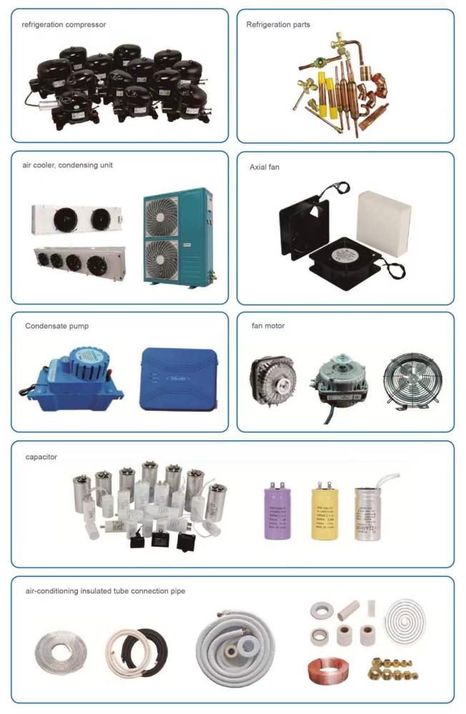 Besides the three products mentioned above, we also specialize in a wide range of other refrigeration products for air conditioner and refrigerator, including copper filter drier, check valve, air conditioning PE insulated copper tube, aluminum and copper tube connection pipes,film capacitors (CBB65, CBB60, CBB61, CD60), air conditioning wrapping tapes, etc. And Air cooler and condenser for are cold room refrigeration system. With 20 years of international experience in the refrigeration industry, we have good cooperation with many suppliers, if you have any requirements, we can source high-quality products with good prices for you in China.