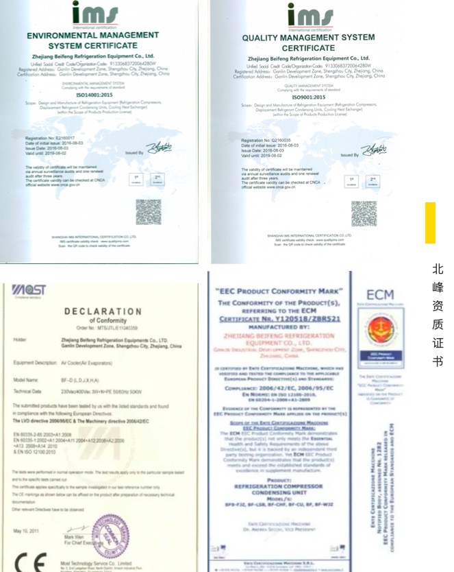 公司已获中国制冷空调行业CRAA产品性能认证,ISO9001:2015质量管理体系认证和ISO14001:2015环境管理体系认证及CE,拥有全国工业产品制造许可证和冷凝器制造许可证及特种设备压力容器产品制造许可证多项证书,获绍兴市重点保护产品,产品部分配件获多项国家专利。