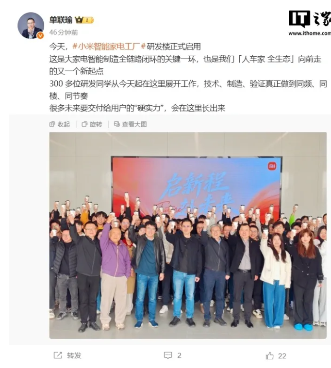 On November 27, it was reported that Shan Lianyu, General Manager of Xiaomi Group's Major Home Appliances Division, posted on Weibo, announcing the official launch of the R&D building at the Xiaomi Smart Home Appliance Factory.