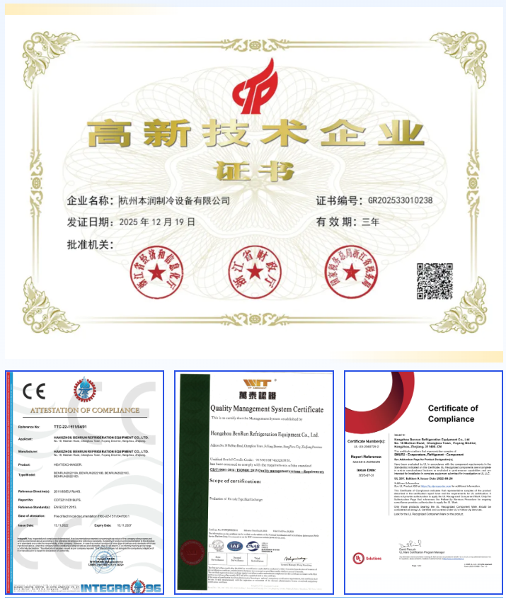 Hangzhou Benrun Refrigeration Equipment Co., Ltd. was established in 2003. It is one of the earliest enterprises in China specializing in the production of finned condensers, evaporators, cooling coils, and air-cooled units. The company owns two production bases and one trading company, with a total factory building area exceeding 20,000 square meters. Equipped with 11 advanced production lines, an independent R&D team, and mature, stable production technology, the company achieves an annual production capacity of 1 million units. Hangzhou Benrun has obtained ISO9001 quality system certification, as well as European CE and UL certifications, ensuring stable and reliable product quality. The finned heat exchanger products manufactured by the company are widely used in industries such as household air conditioners, automotive air conditioners, portable air conditioners, central air conditioning systems, dehumidifiers, air-source heat pumps, surface coolers, refrigeration and cold storage equipment, air conditioning for communication environment control systems, sewage treatment systems, air-cooled units, chillers, marine and industrial cooling systems.