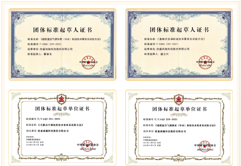 Xinsheng also participated in drafting group standards including Technical Requirements and Test Methods for Direct Expansion Air Conditioning Units and Technical Requirements and Test Methods for Ultra-low Temperature Air Source Heat Pump (Water Chiller) Units.